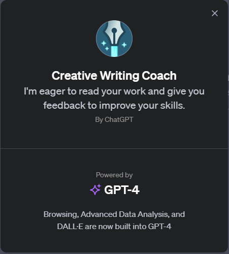 GPT-4는 "Creative Writing Coach"라는 특정 기능을 명시적으로 가지고 있지는 않지만, 창작 글쓰기를 돕는 코치로 활용될 수 있습니다. 이는 GPT-4의 언어 이해 및 생성 능력을 활용하여 글쓰기 과정에서 창의적인 아이디어를 제공하고, 구조적인 조언을 하며, 작문 스킬을 향상시키는 데 도움을 줄 수 있습니다.