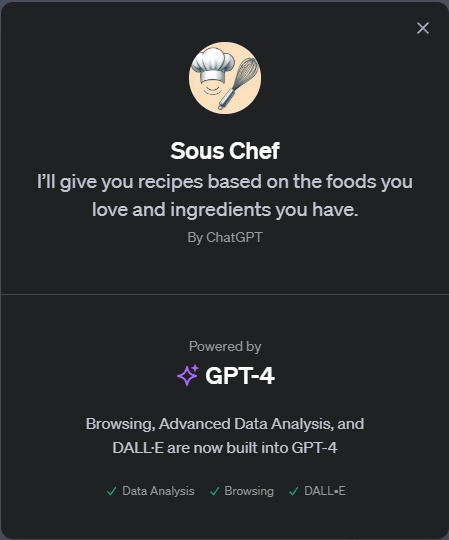 GPT-4는 "Sous Chef"라는 특정 기능이나 도구를 가지고 있지는 않지만, 소스 셰프(sous chef) 역할을 할 수 있는 언어 모델입니다. 소스 셰프는 주방에서 주방장(chef de cuisine) 다음으로 높은 직위를 맡는 셰프로, 주방의 일상적인 운영을 관리하고 음식 준비를 돕는 역할을 합니다. GPT-4를 이용하여 요리 과정에 도움을 줄 수 있는 조언을 얻거나, 레시피를 개발하고, 요리법을 향상시킬 수 있습니다.