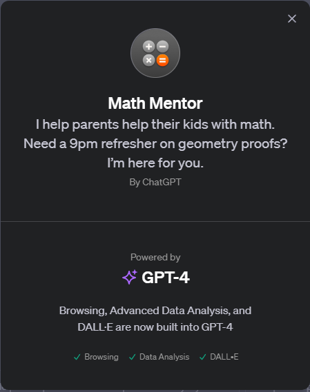 GPT-4 모델은 "Math Mentor"라는 특정 기능을 가지고 있지는 않지만, 수학 멘토 역할을 수행하는 데 사용될 수 있습니다. GPT-4는 다양한 수학적 개념을 설명하고, 수학 문제를 해결하는 데 도움을 줄 수 있는 능력을 가지고 있습니다. 이를 통해 사용자는 수학 학습을 보조하고, 문제 해결 능력을 향상시킬 수 있습니다.
