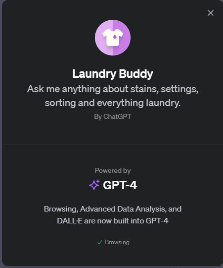 GPT-4는 "Laundry Buddy"라는 특정 기능을 가지고 있는 것이 아니라, 다양한 주제에 대해 대화와 정보 제공을 할 수 있는 고급 언어 모델입니다. 그러나 GPT-4를 세탁과 관련된 도우미로 사용하는 것이 가능합니다. 사용자가 세탁에 대한 질문을 하거나, 세탁 팁, 세탁 기호 해석, 얼룩 제거 방법 등에 대한 조언을 구할 때 도움을 줄 수 있습니다.
