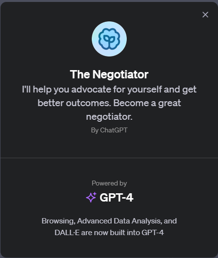 GPT-4에서 "The Negotiator"라는 특정 기능이나 모드는 현재로서는 존재하지 않습니다. 그러나, GPT-4의 고급 언어 처리 능력을 활용하여 협상 기술이나 전략에 대한 조언을 얻거나, 협상 시나리오를 연습하는 데 사용할 수 있습니다.